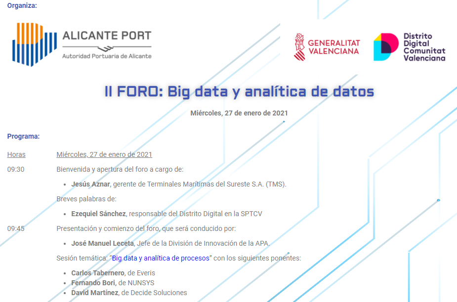 Districte Digital Comunitat Valenciana i l’Autoritat Portuària d’Alacant (APA) celebren, el dimecres 27 de gener de 9h30 a 11h30, el II Fòrum Big Data i Analítica de Dades, en el marc del Fòrum Tecnològic Logístic – Portuari, en format virtual. Aquest fòrum, del qual ja s’ha celebrat una I edició, té com a objectiu promoure la innovació oberta, posant en contacte ofereix i demanda del propi Clúster Logístic-Portuari. Així mateix, aquestes reunions serviran per a identificar idees amb vista a futures convocatòries de programes autonòmics, Fons Ports 4.0 de Ports de l’Estat i programes europeus (2021-2027).